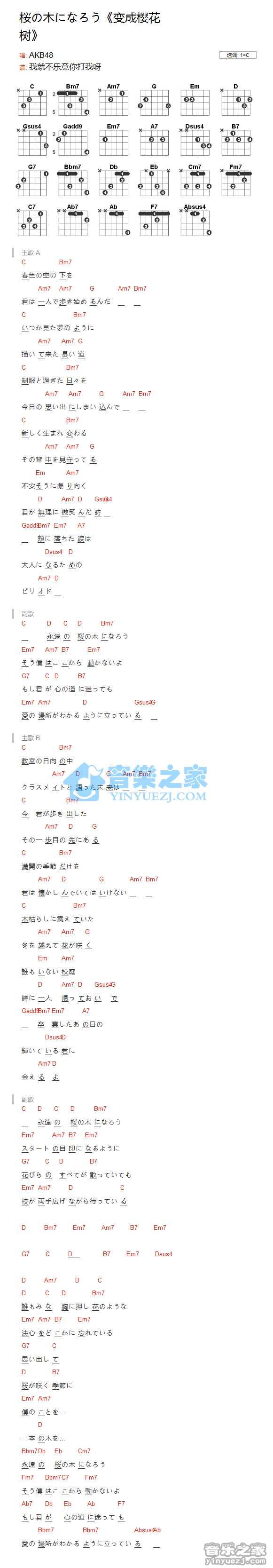 吉他AKB48《变成樱花树》吉他谱_吉他弹唱谱_YYZJ编配