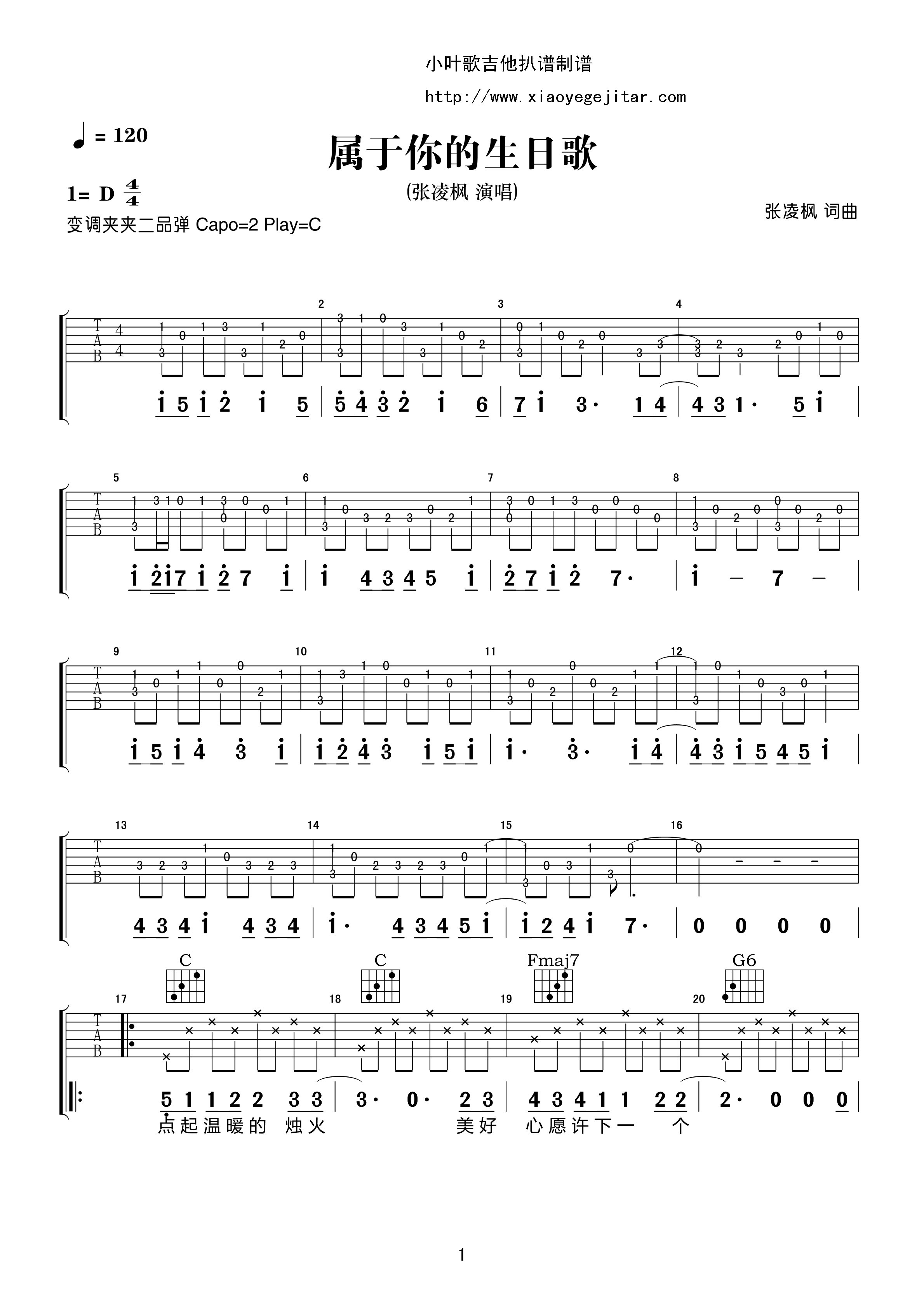 吉他张凌枫《属于你的生日歌》吉他谱_吉他弹唱谱_小叶歌编配