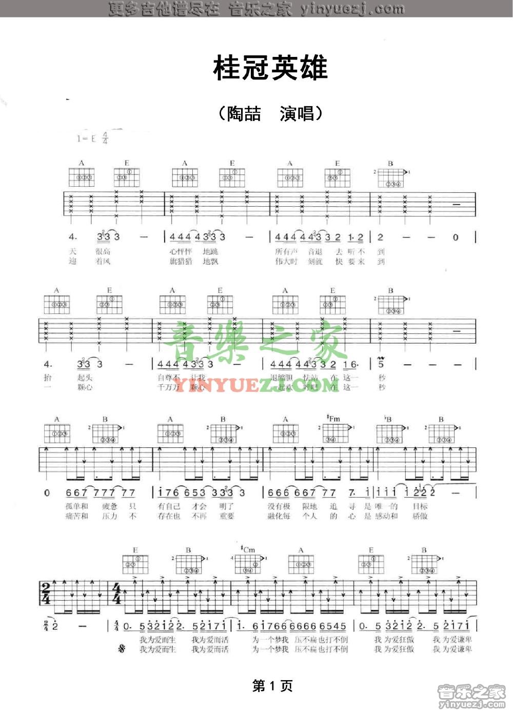 陶喆《桂冠英雄》吉他谱,YYZJ编配出品,共有2张高清图谱,免翻页排版设计。...