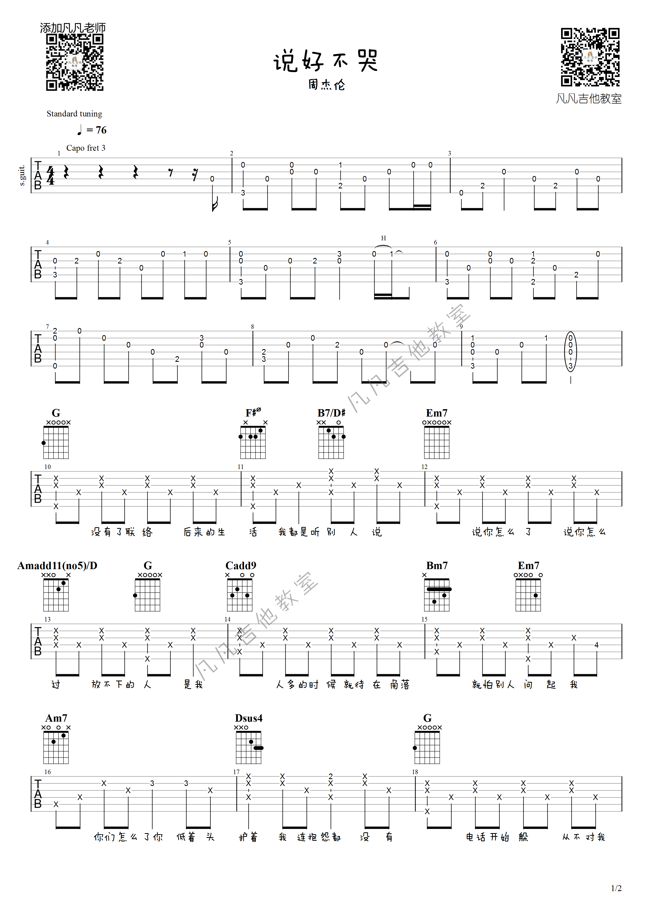 周杰伦《说好不哭》吉他谱,共有2张高清图谱,免翻页排版设计。...