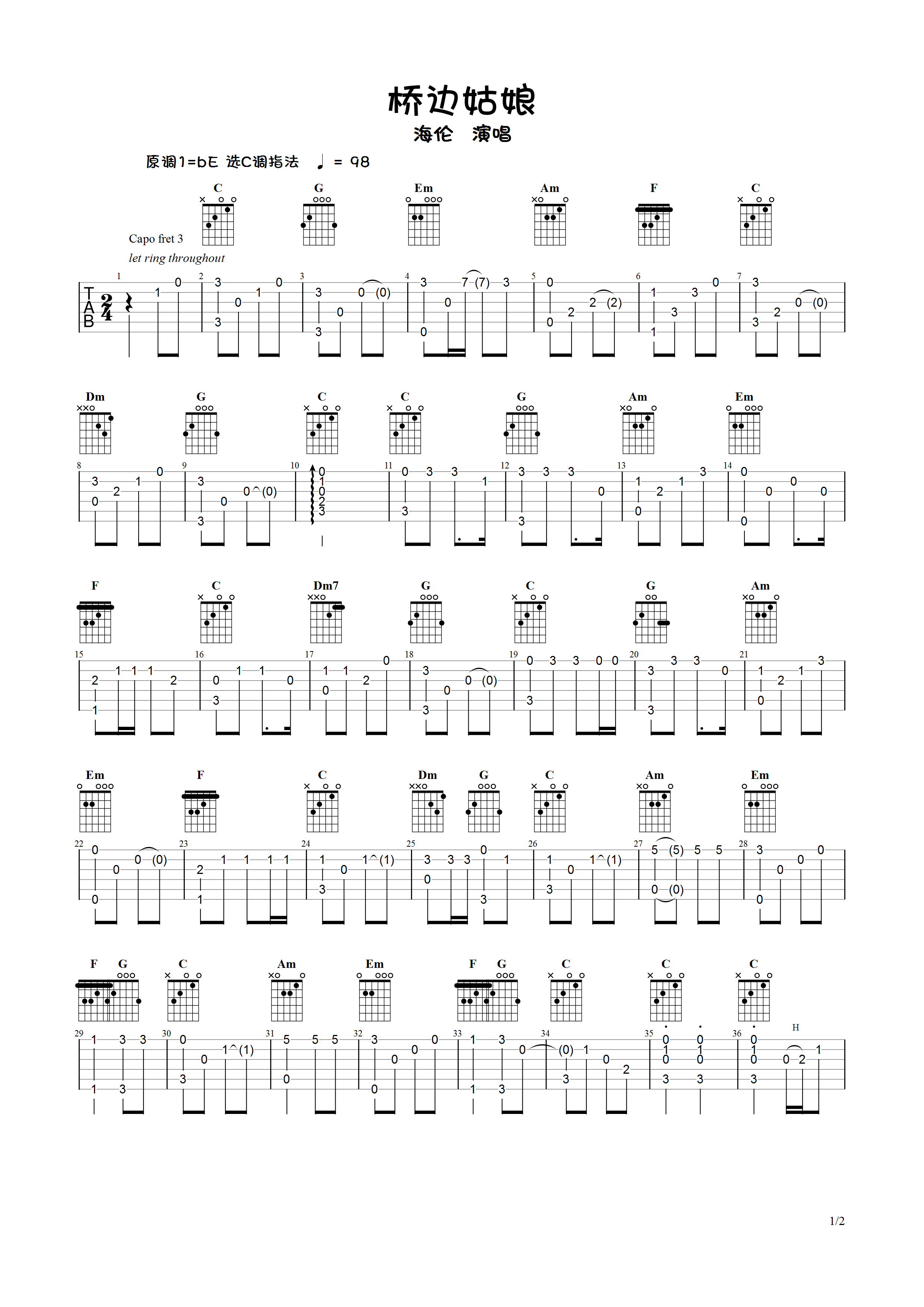 海伦《桥边姑娘》吉他谱,弹吉他的勺子编配出品,共有2张高清图谱,免翻页排版设计。...