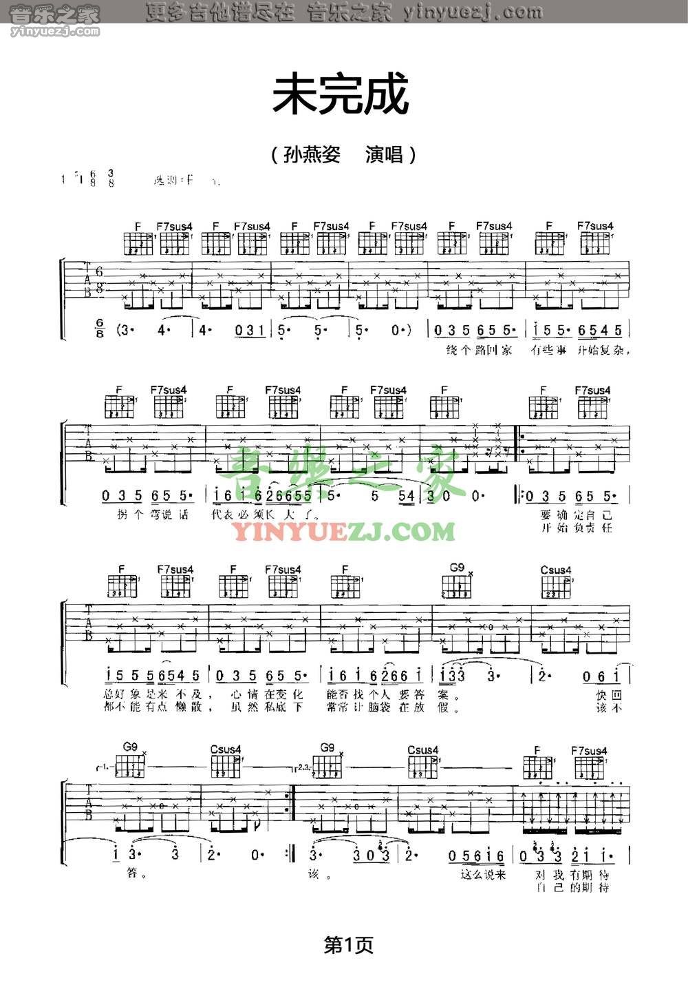 吉他孙燕姿《未完成》吉他谱_吉他弹唱谱_YYZJ编配