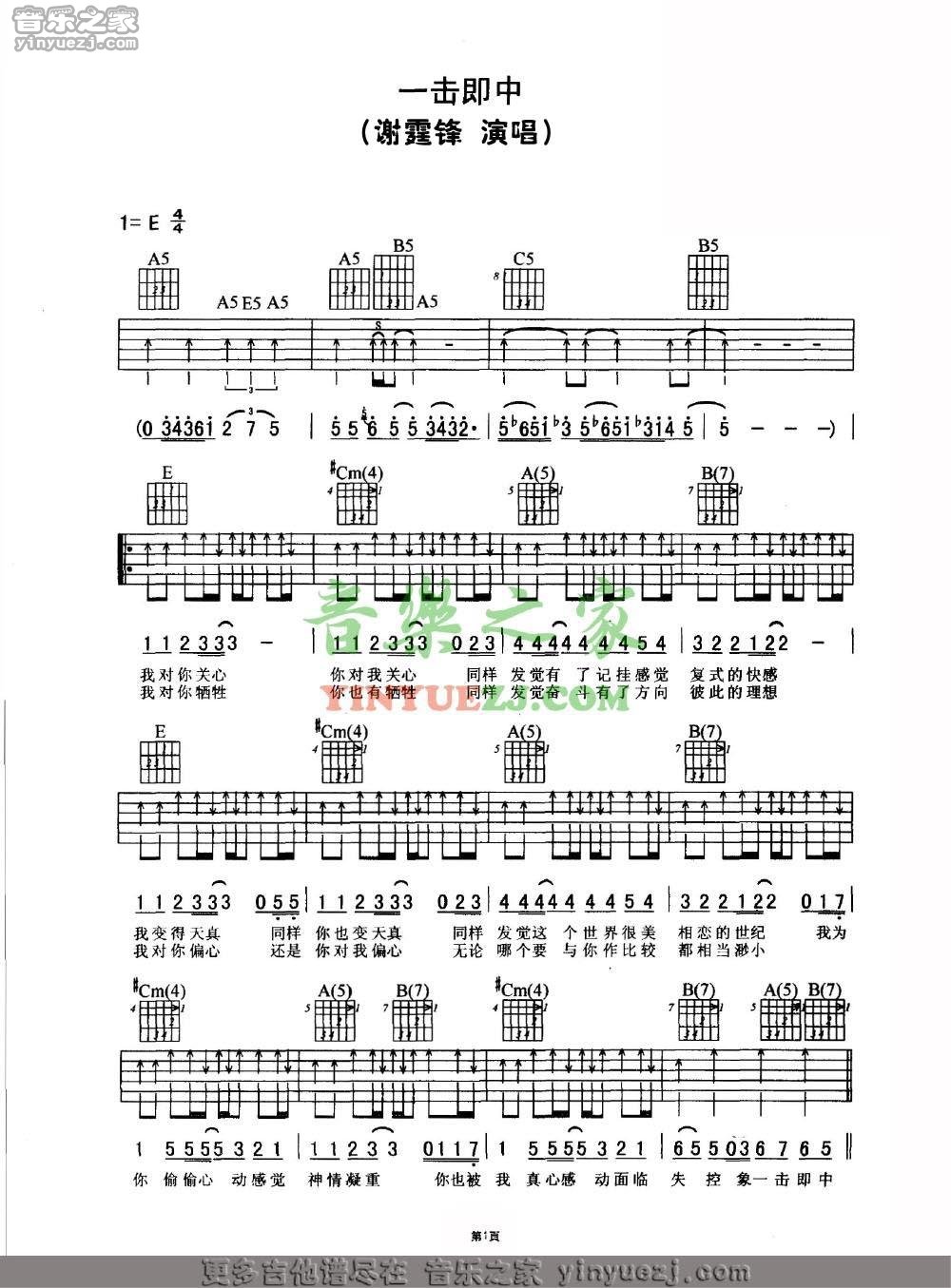 谢霆锋《一击即中》吉他谱,YYZJ编配出品,共有2张高清图谱,免翻页排版设计。...