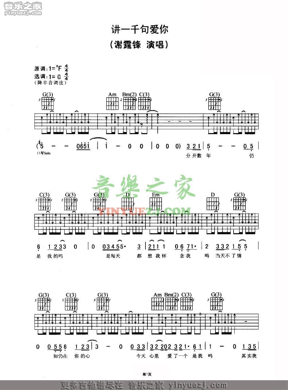谢霆锋《讲一千句我爱你》吉他谱,YYZJ编配出品,共有3张高清图谱。...