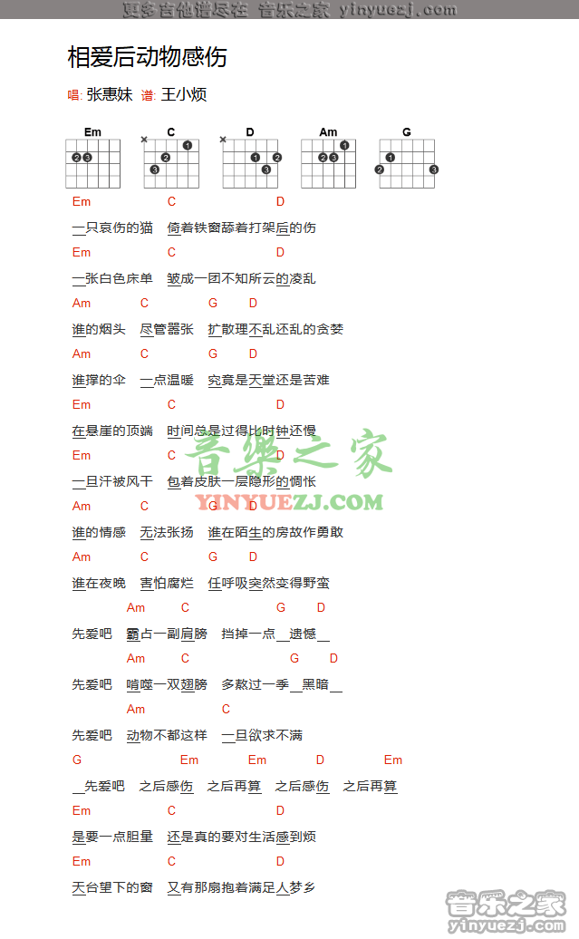 吉他张惠妹《相爱后动物感伤》吉他谱_吉他弹唱谱_YYZJ编配