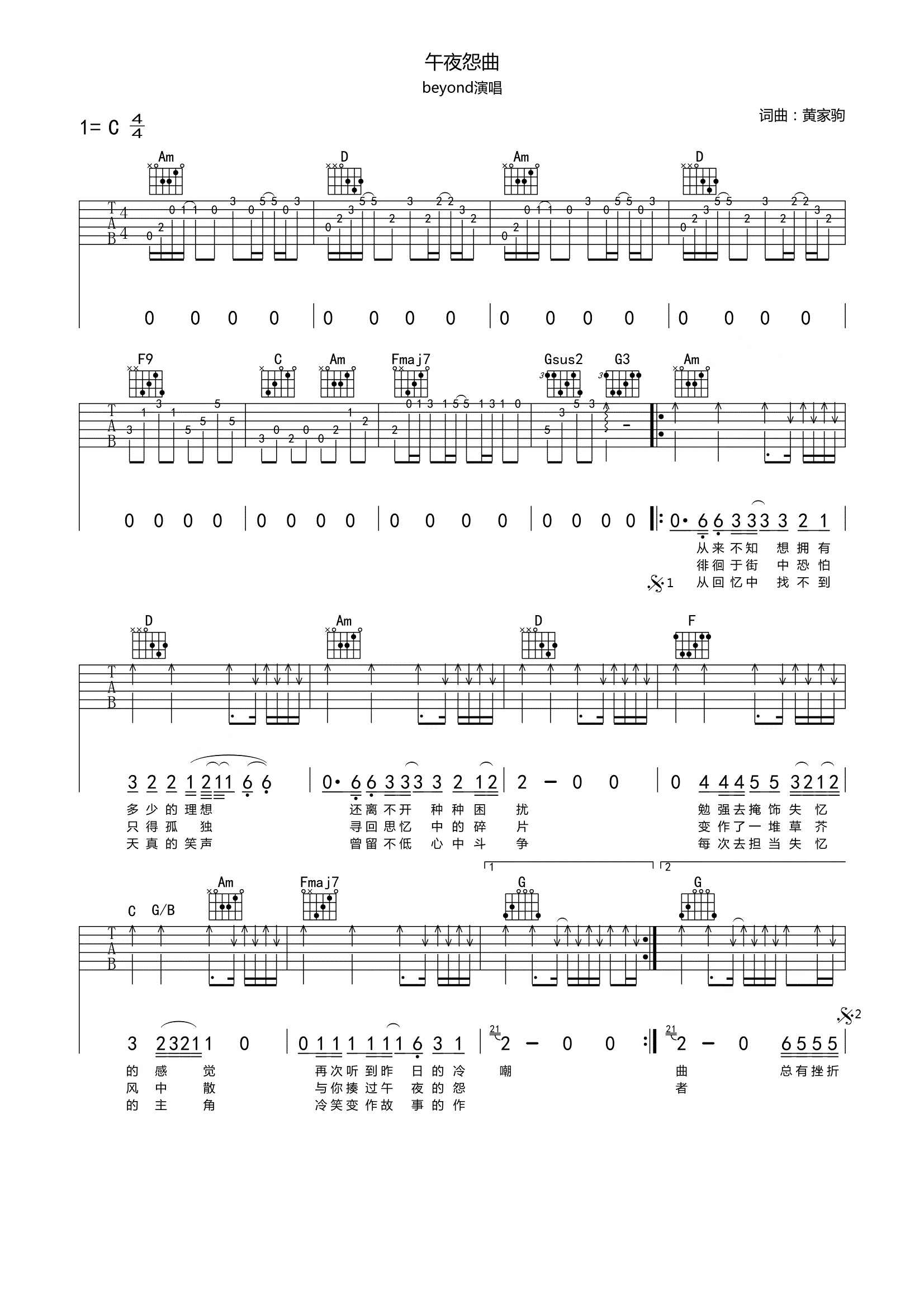 beyond《午夜怨曲》吉他谱,共有2张高清图谱,免翻页排版设计。...