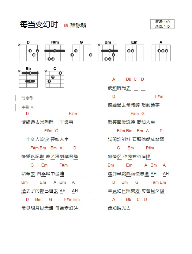 吉他谭咏麟《每当变幻时》吉他谱_吉他弹唱谱_YYZJ编配
