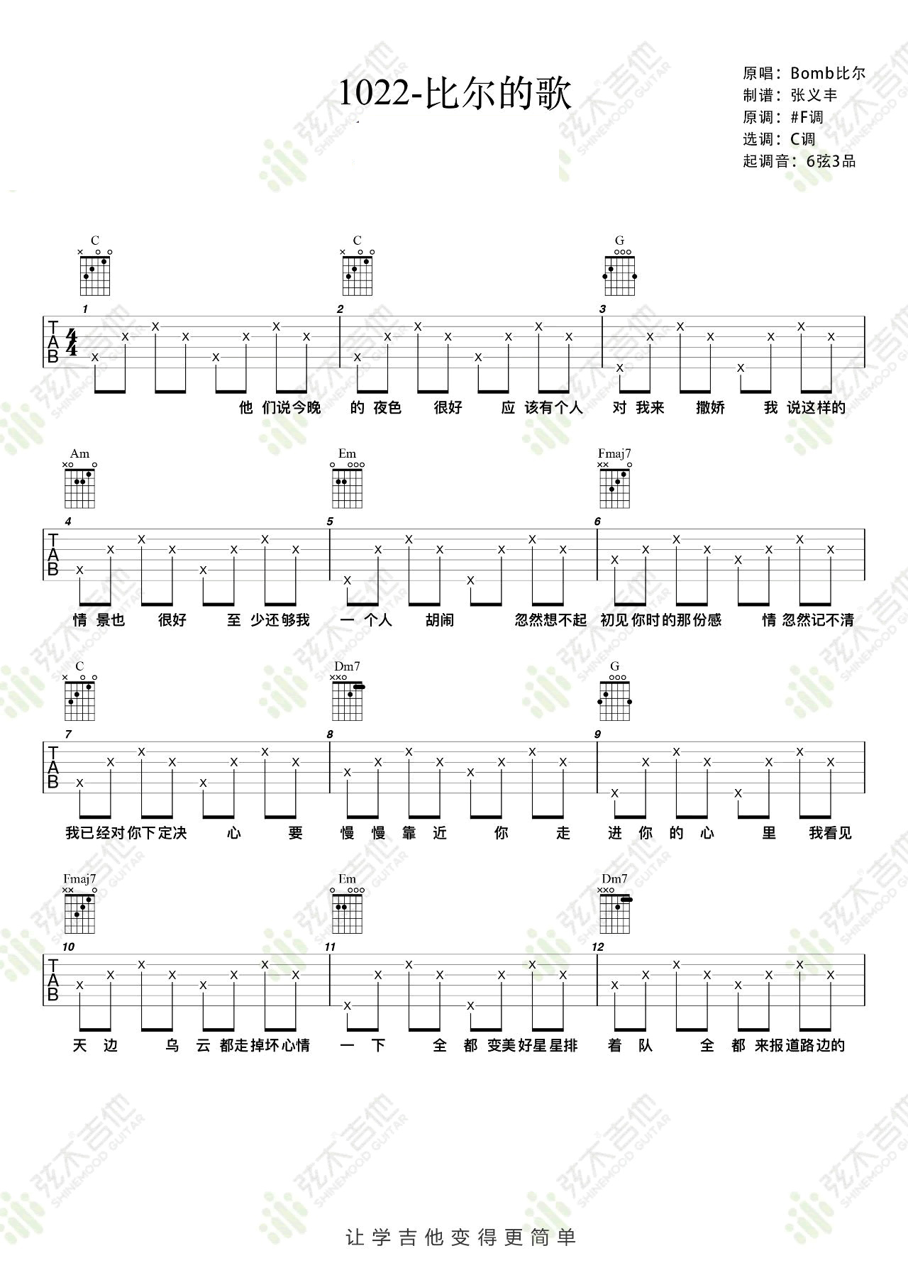 吉他Bomb比尔《1022-比尔的歌》吉他谱_吉他弹唱谱_弦木吉他编配