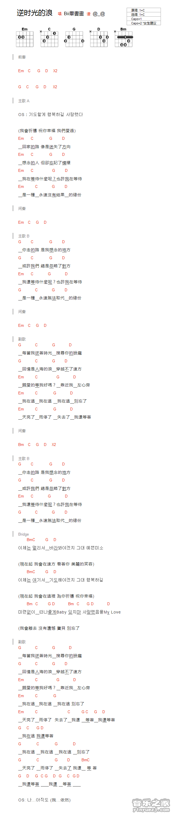 吉他毕书尽《逆时光的浪》吉他谱_吉他弹唱谱_YYZJ编配