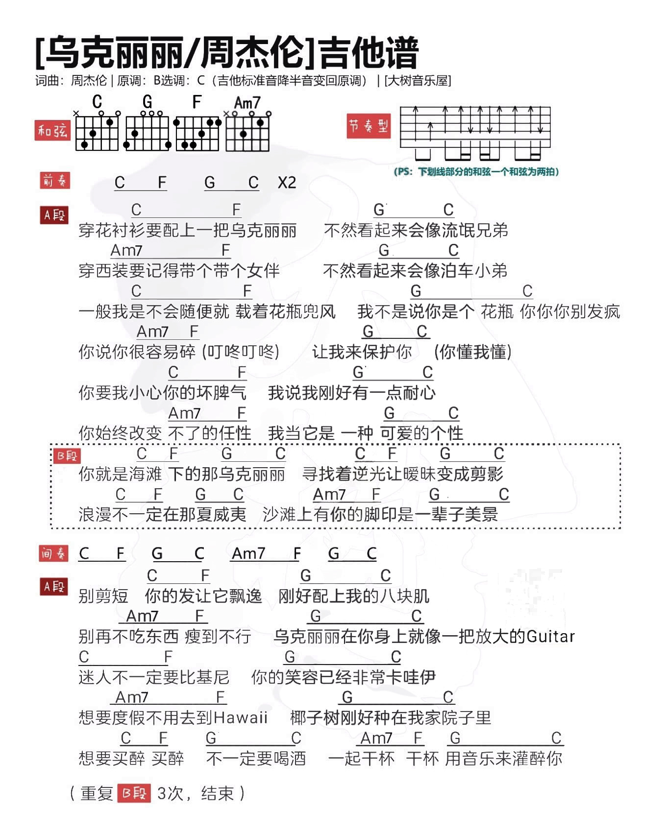 吉他周杰伦《乌克丽丽》吉他谱_吉他弹唱谱_大树音乐屋编配