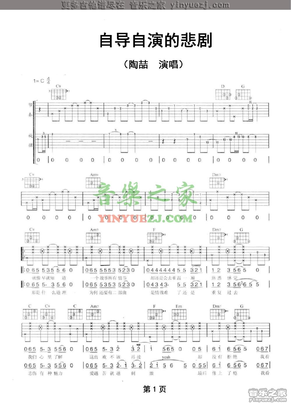 陶喆《自导自演的悲剧》吉他谱,YYZJ编配出品,共有3张高清图谱。...
