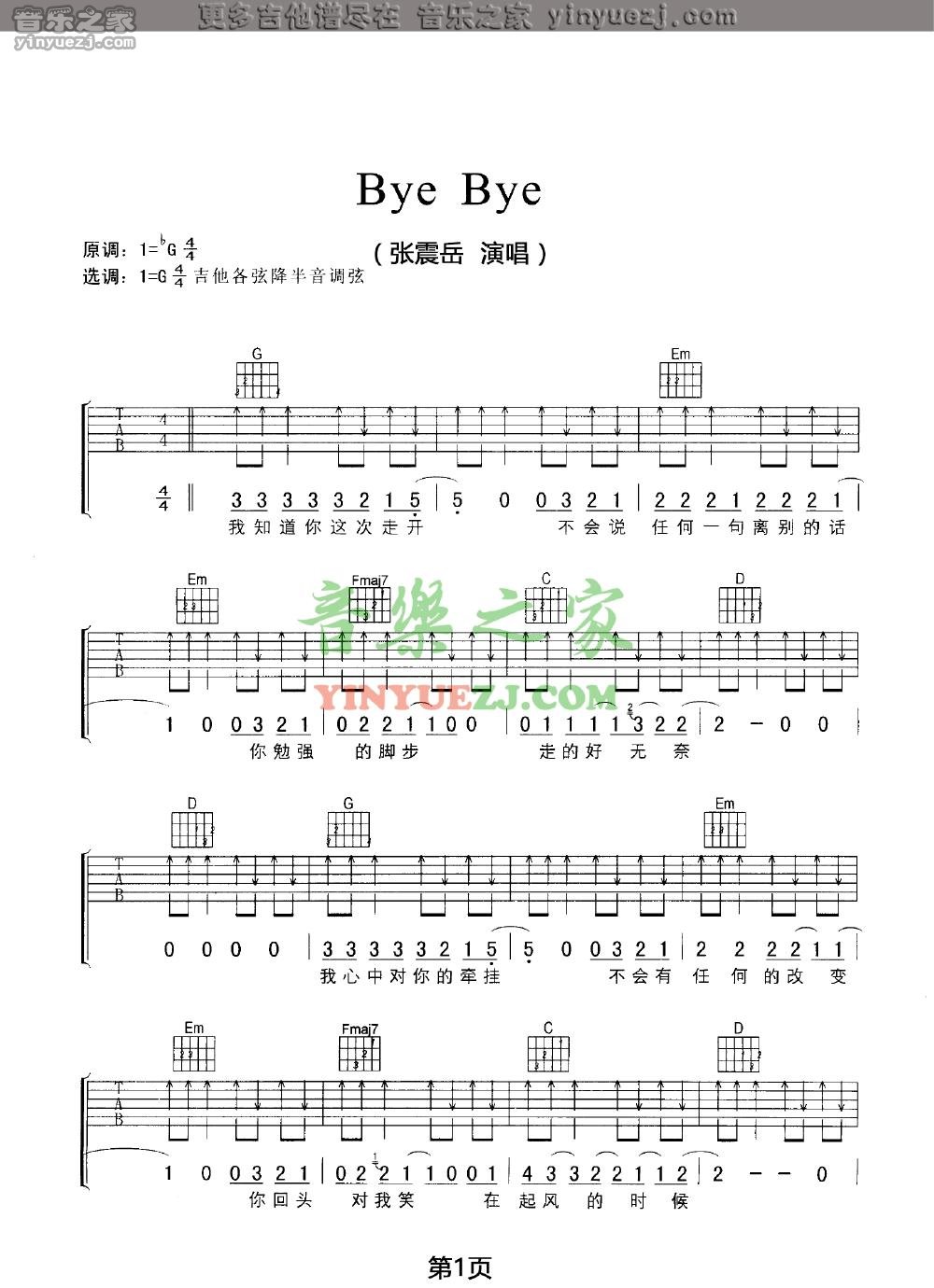 吉他张震岳《bye bye》吉他谱_吉他弹唱谱_YYZJ编配