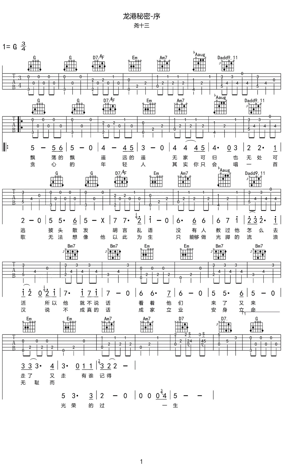吉他尧十三《龙港秘密》吉他谱_吉他弹唱谱
