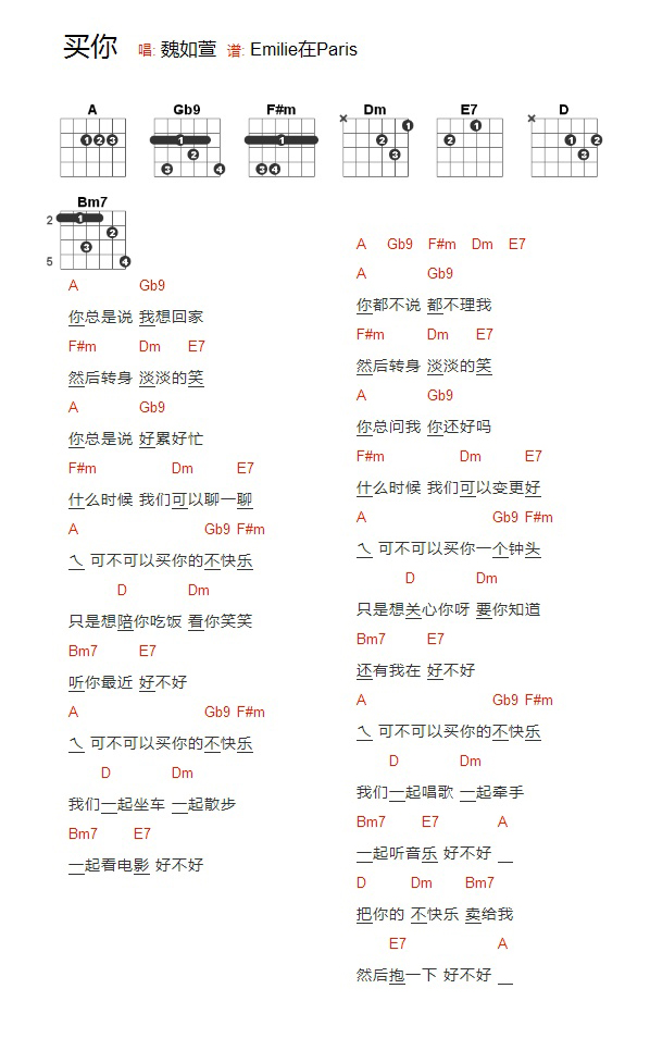 魏如萱《买你》吉他谱,YYZJ编配出品,共有1张高清图谱,免翻页排版设计。...
