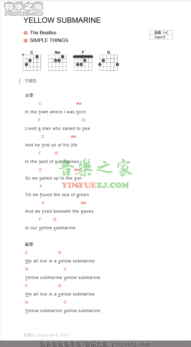 吉他Beatles《yellow submarine》吉他谱_吉他弹唱谱_YYZJ编配