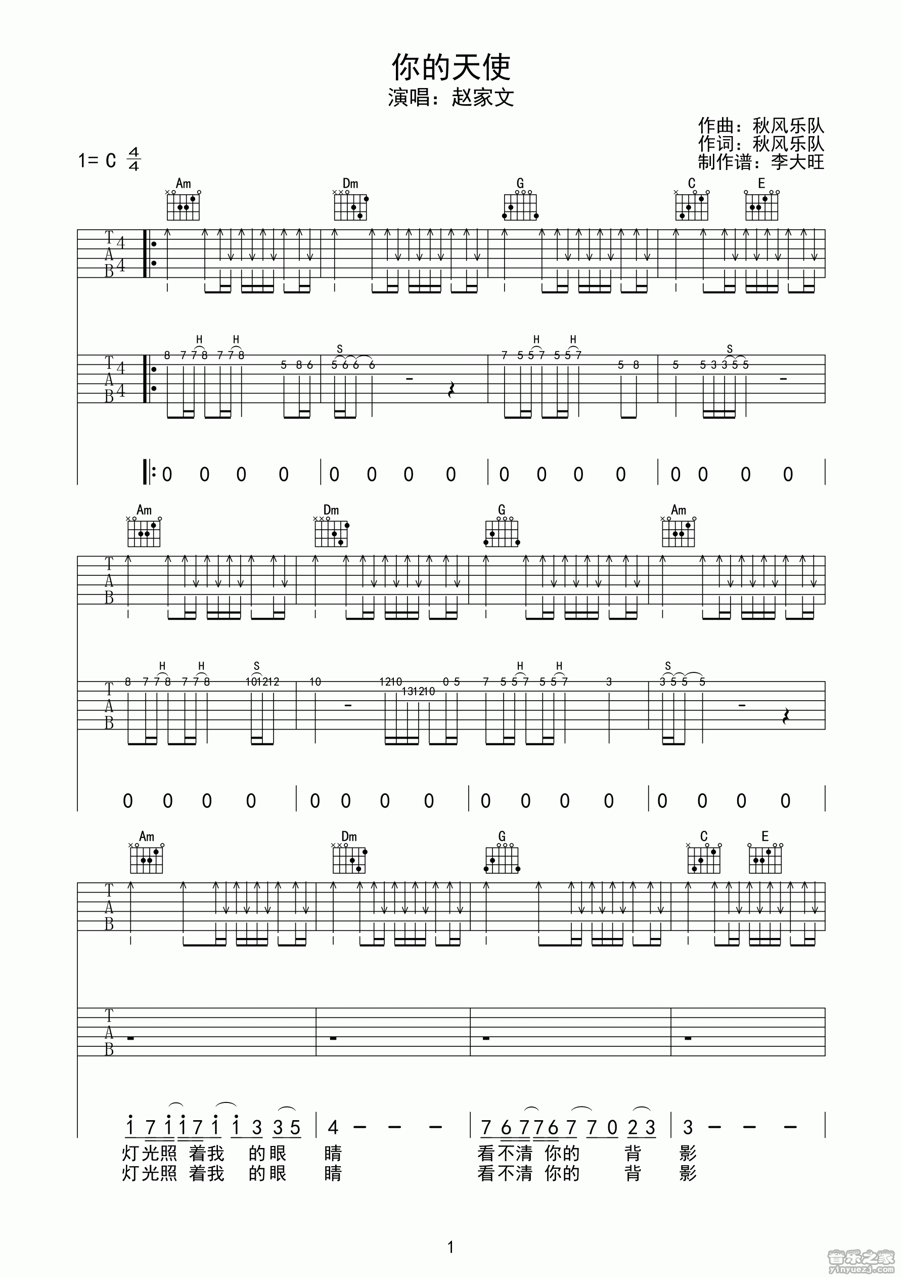 吉他赵家文《你的天使》吉他谱_吉他弹唱谱_李大旺编配