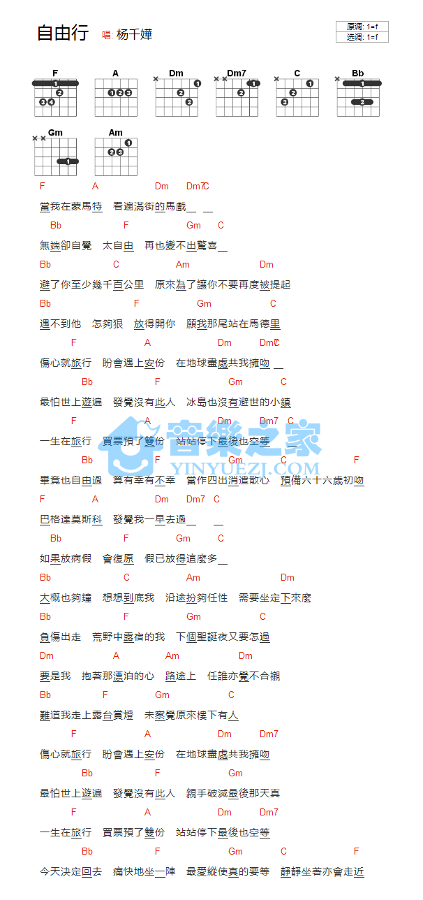 吉他杨千嬅《自由行》吉他谱_吉他弹唱谱_YYZJ编配