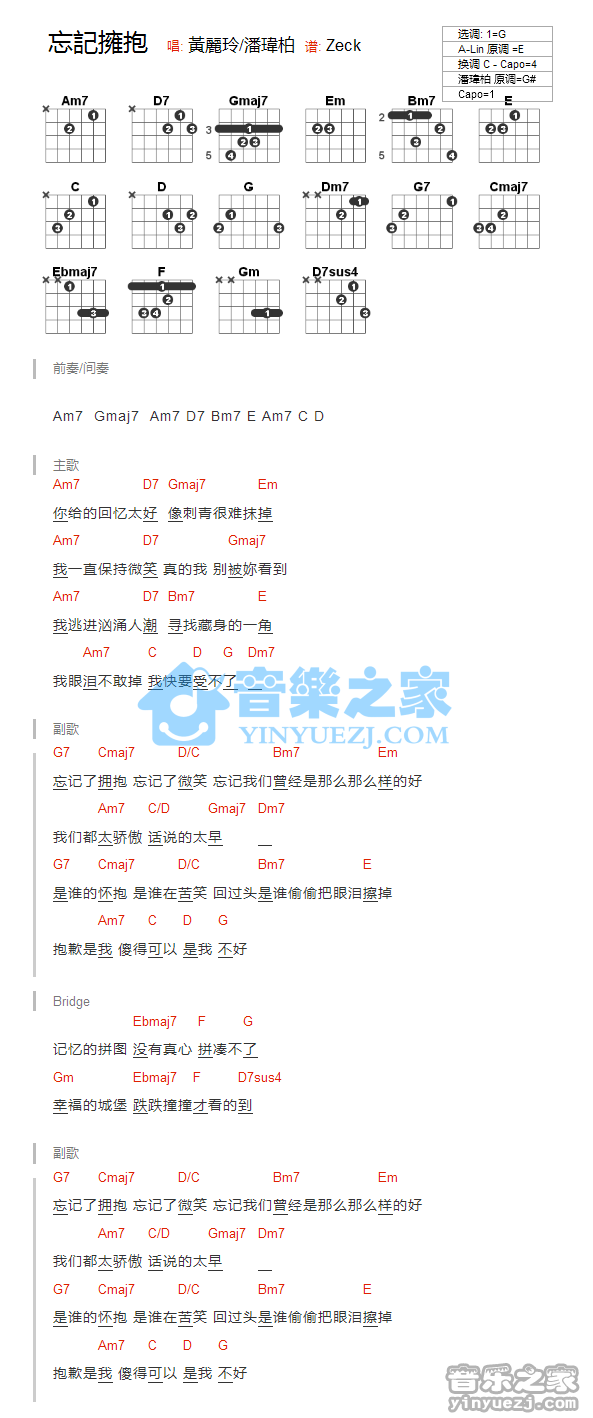 吉他黄丽玲/潘玮柏《忘记拥抱》吉他谱_吉他弹唱谱_YYZJ编配