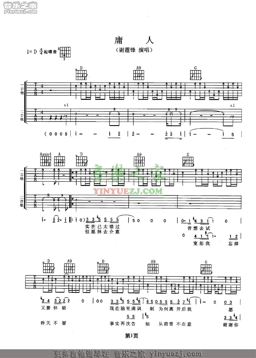 谢霆锋《庸人》吉他谱,YYZJ编配出品,共有3张高清图谱。...