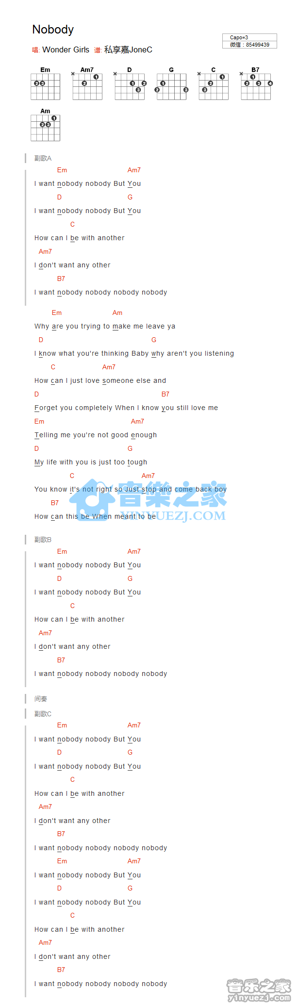 吉他Wondergirls《Nobody》吉他谱_吉他弹唱谱_YYZJ编配