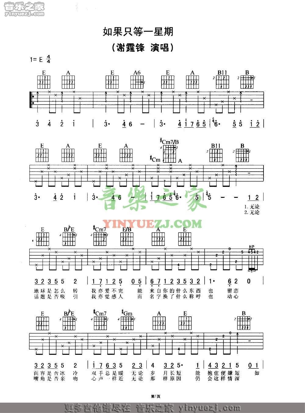 谢霆锋《如果只得一星期》吉他谱,YYZJ编配出品,共有3张高清图谱。...