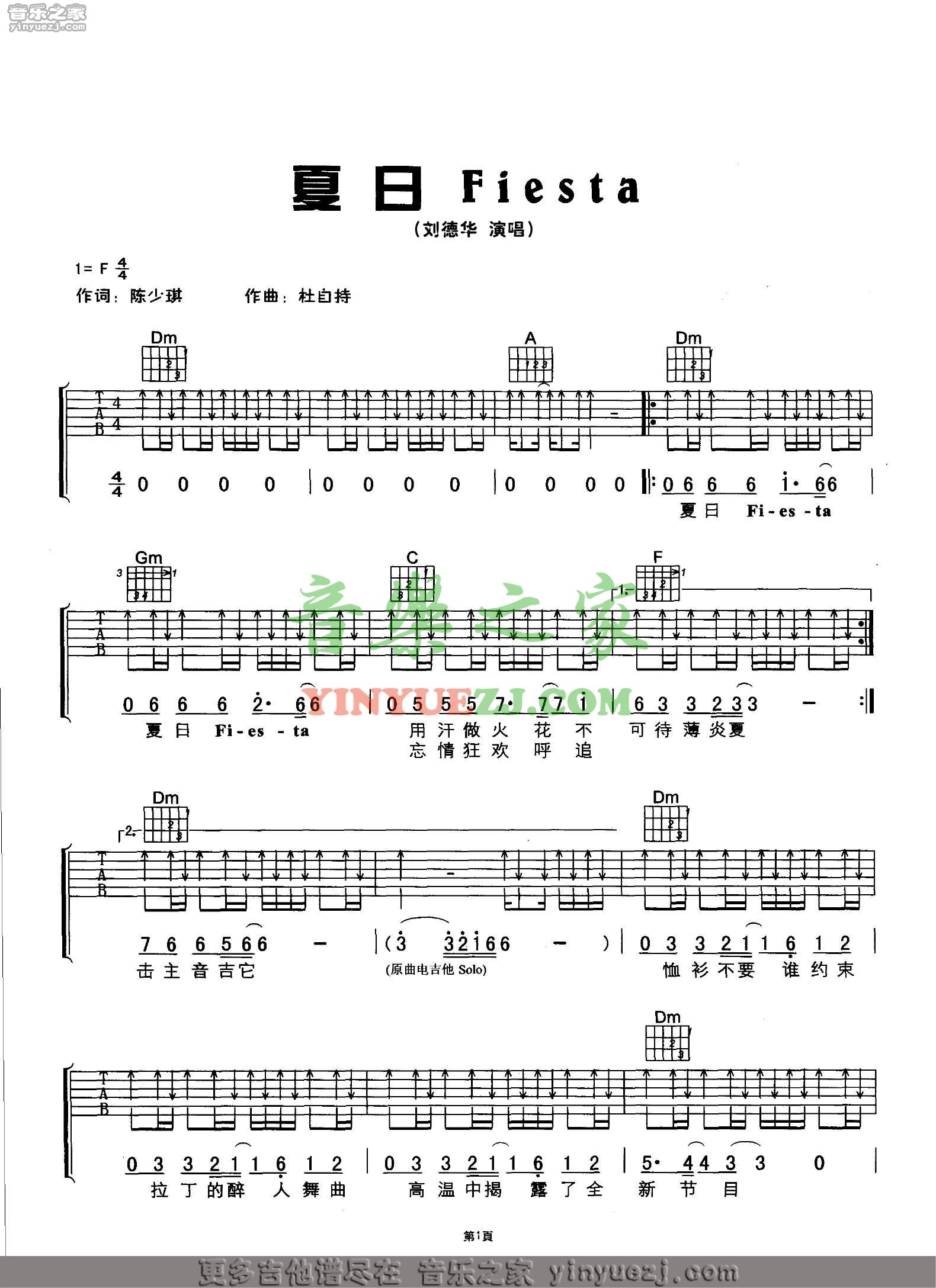 刘德华《夏日fiesta》吉他谱,YYZJ编配出品,共有3张高清图谱。...