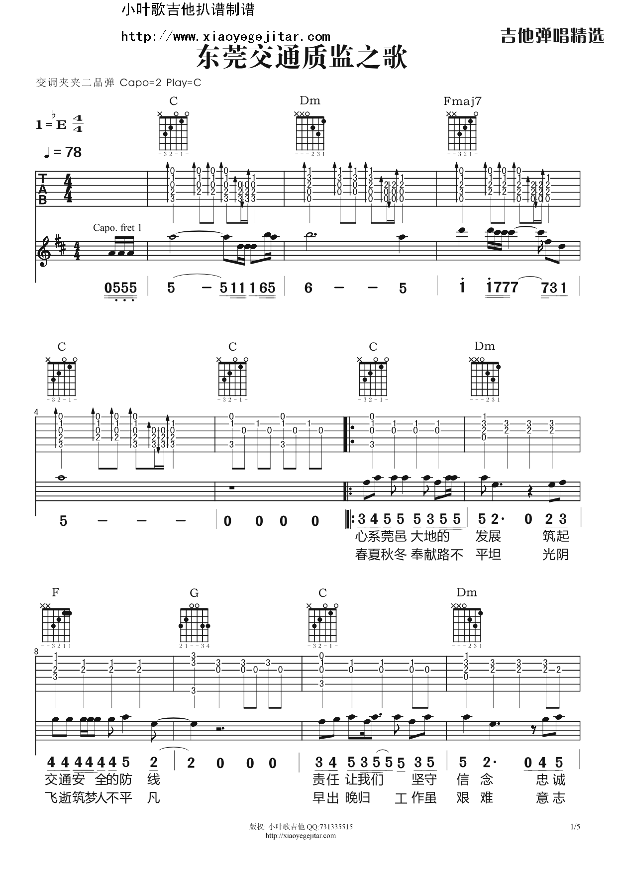 《东莞交通质监之歌》吉他谱,小叶歌编配出品,共有5张高清图谱。...