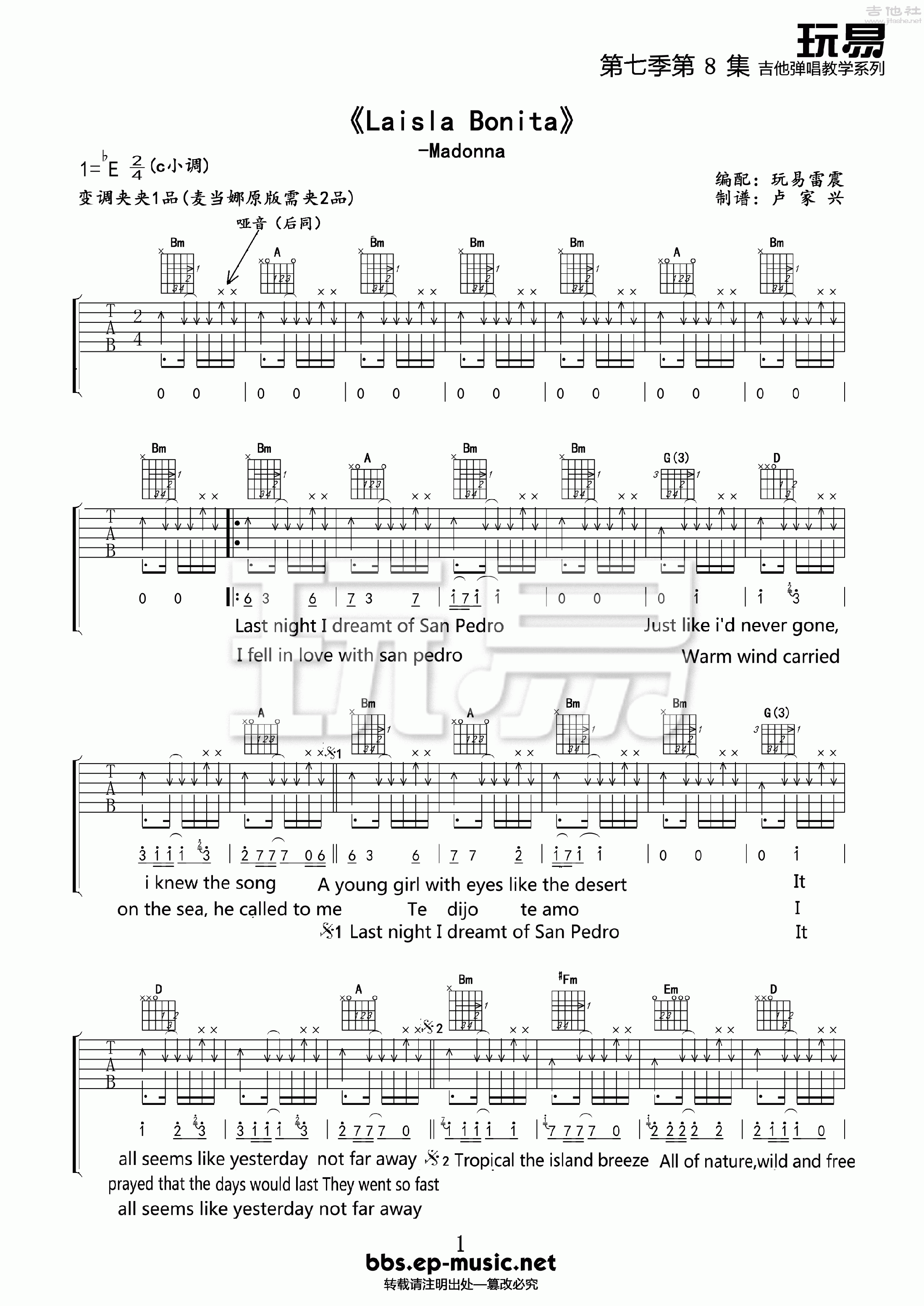 麦当娜《LaIslaBonita》吉他谱,玩易编配出品,共有4张高清图谱。...