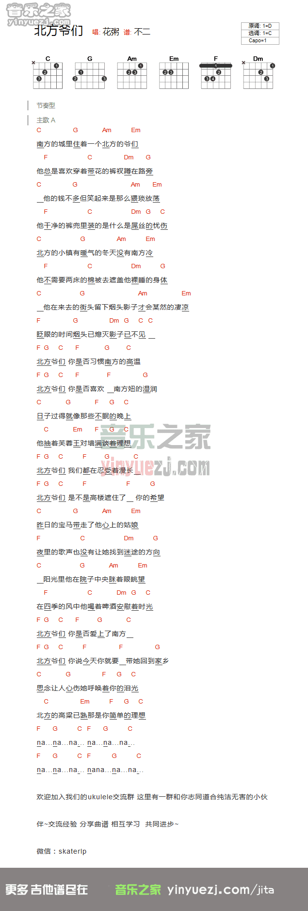 花粥《北方爷们》吉他谱,YYZJ编配出品,共有1张高清图谱,免翻页排版设计。...