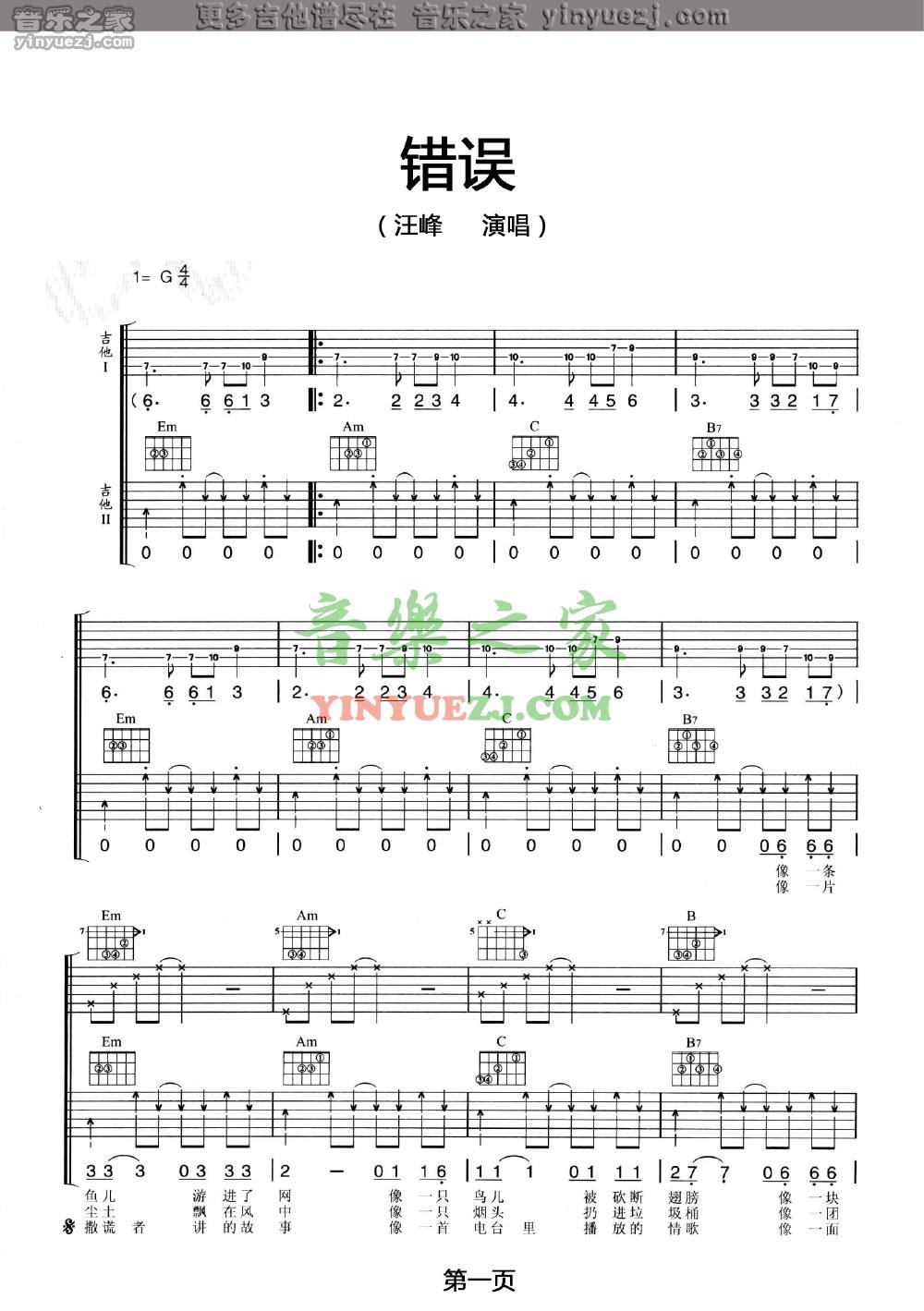 吉他汪峰《错误》吉他谱_吉他弹唱谱_YYZJ编配
