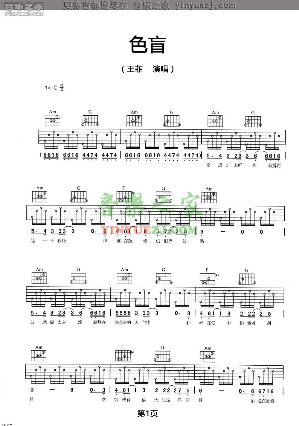 吉他王菲《色盲》吉他谱_吉他弹唱谱_YYZJ编配
