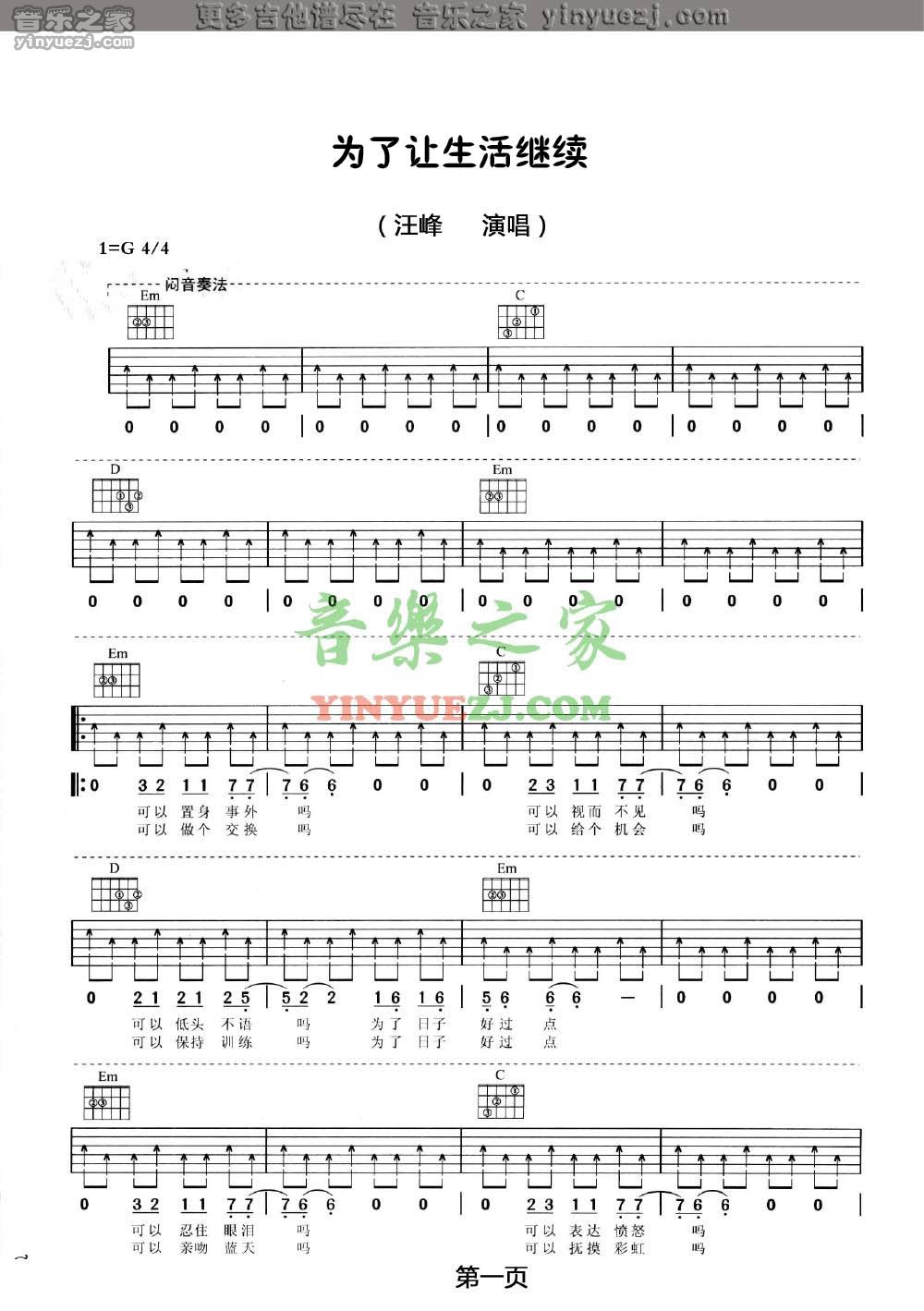 吉他汪峰《为了让生活继续》吉他谱_吉他弹唱谱_YYZJ编配