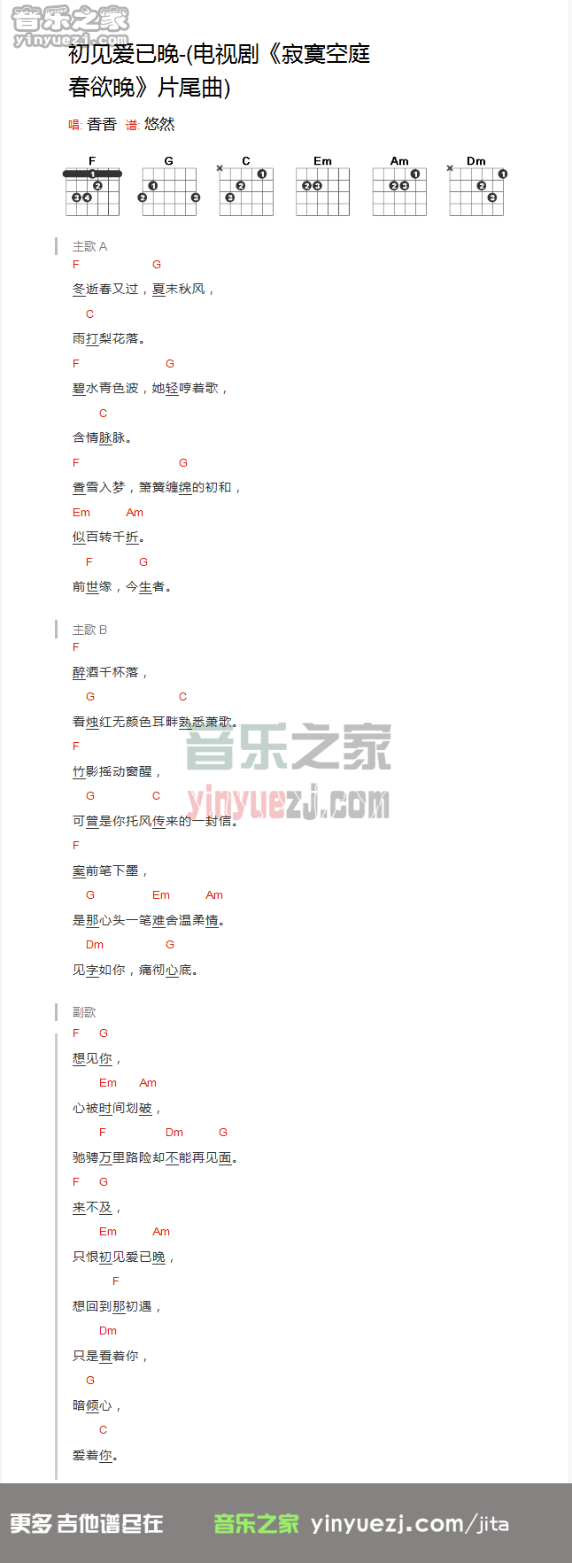 吉他香香《初见爱已晚》吉他谱_吉他弹唱谱_YYZJ编配