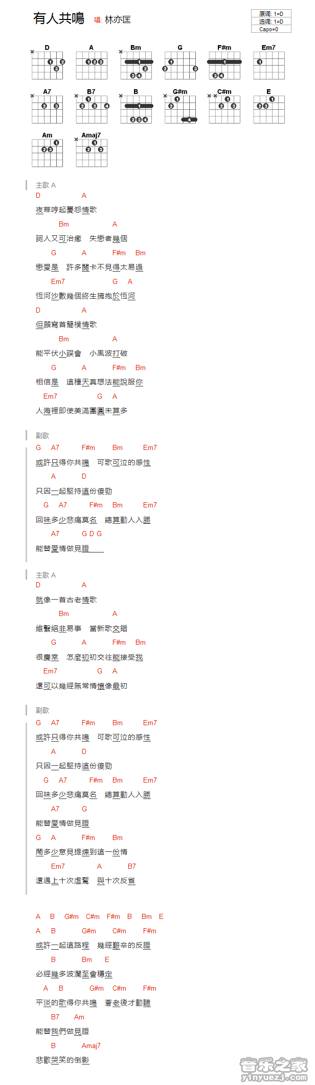 吉他林亦匡《有人共鸣》吉他谱_吉他弹唱谱_YYZJ编配