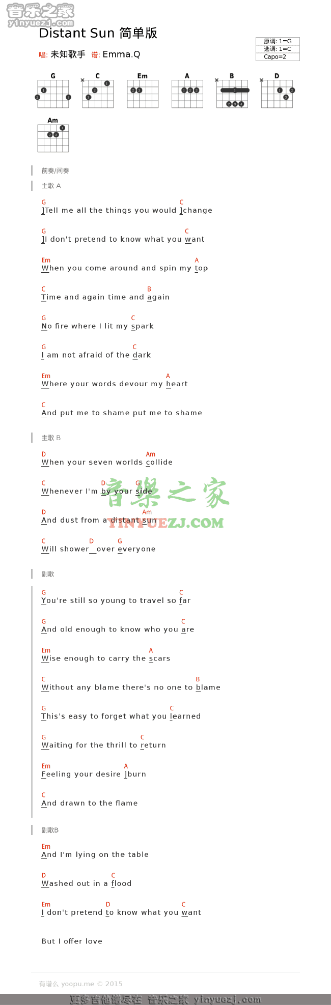 CrowdedHouse《distantsun》吉他谱,YYZJ编配出品,共有1张高清图谱,免翻页排版设计。...