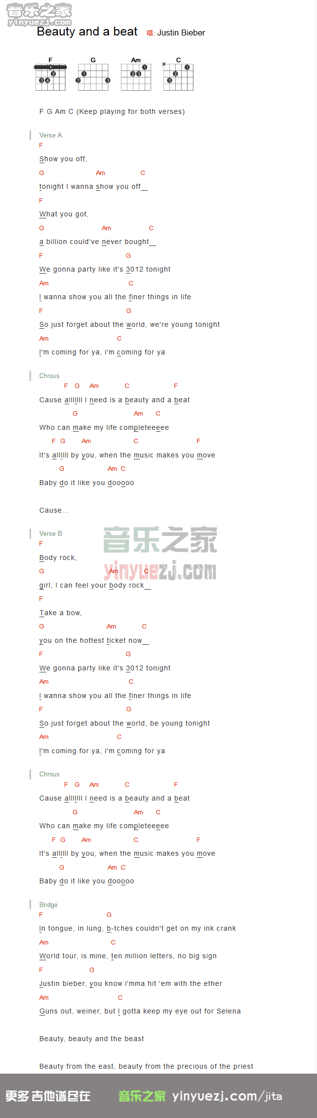 吉他Justin Bieber 《beautiful and a beat》吉他谱_吉他弹唱谱_YYZJ编配