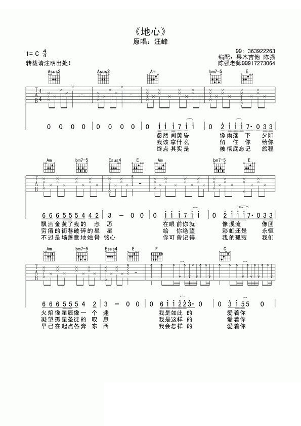 吉他汪峰《地心》吉他谱_吉他弹唱谱_果木浪子编配