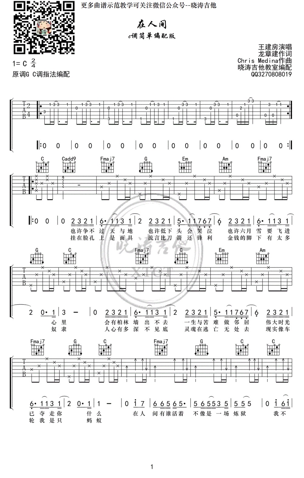 吉他王健房《在人间》吉他谱_吉他弹唱谱_晓涛吉他编配