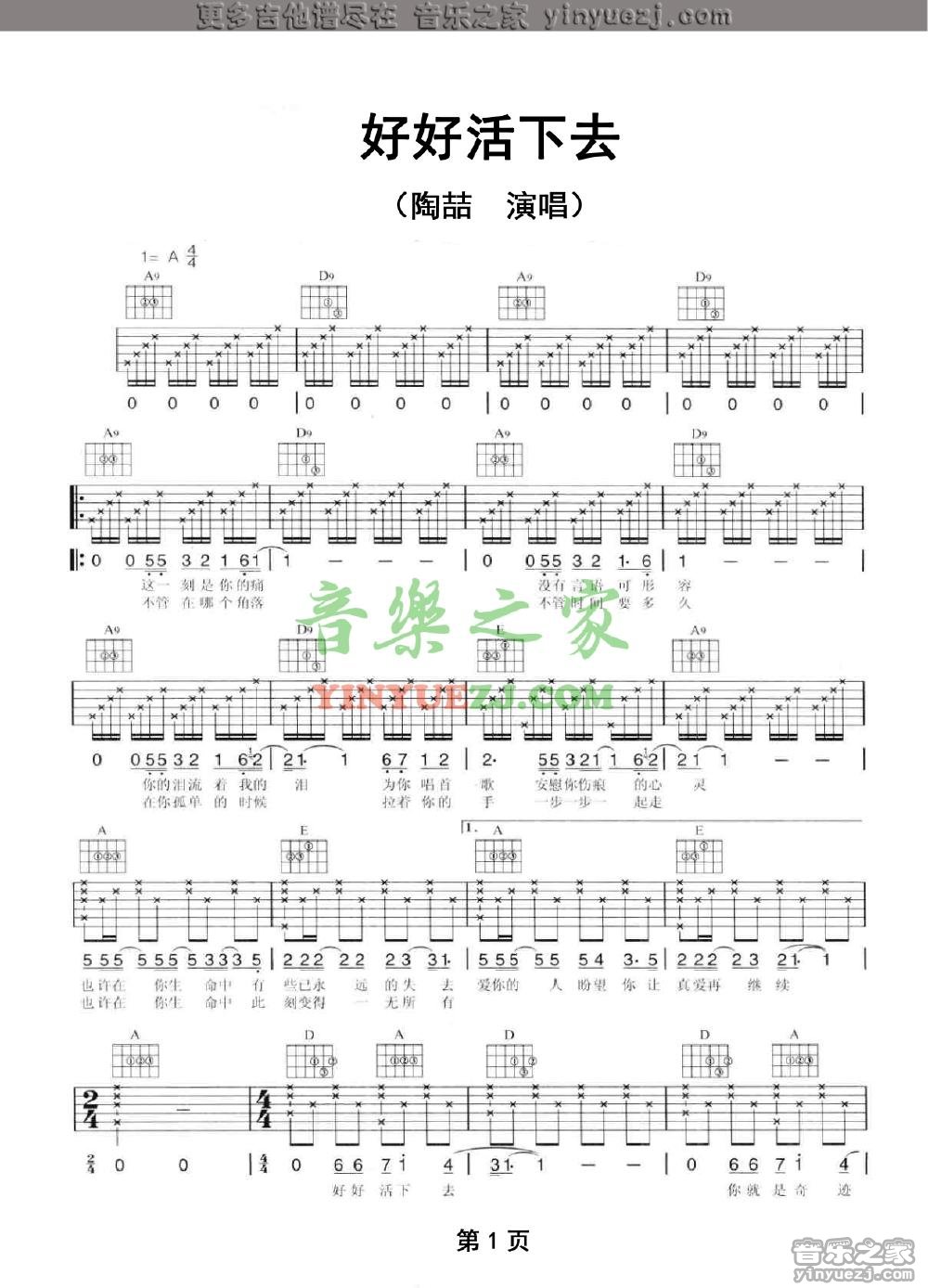 陶喆《好好活下去》吉他谱,YYZJ编配出品,共有2张高清图谱,免翻页排版设计。...