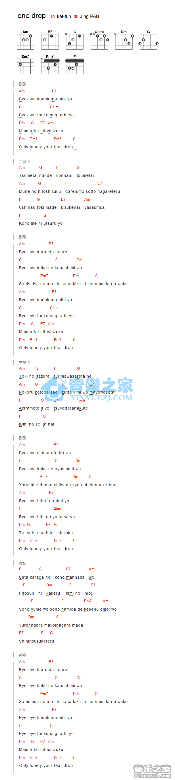 吉他kat-tun《one drop》吉他谱_吉他弹唱谱_YYZJ编配