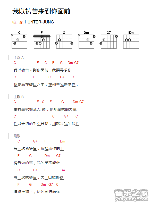 吉他HUNTER-JUNG《我以祷告来到你面前》吉他谱_吉他弹唱谱_YYZJ编配