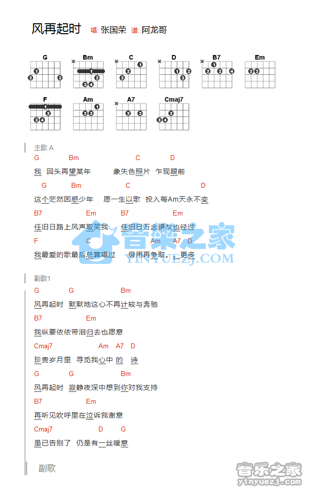 吉他张国荣《风再起时》吉他谱_吉他弹唱谱_YYZJ编配