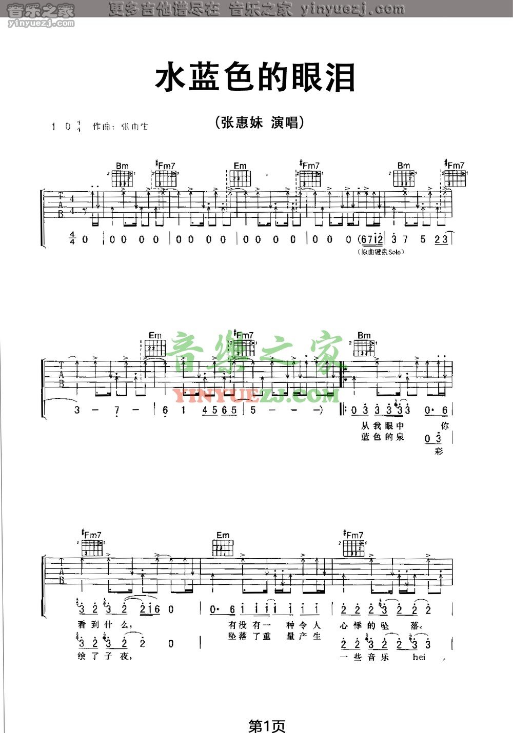 张惠妹《水蓝色的眼泪》吉他谱,YYZJ编配出品,共有4张高清图谱。...
