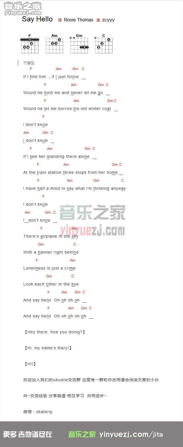 RosieThomas《sayhello》吉他谱,YYZJ编配出品,共有1张高清图谱,免翻页排版设计。...