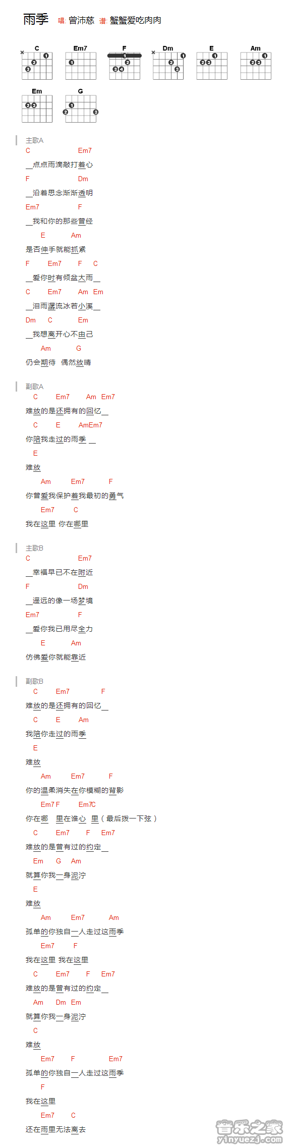 吉他曾沛慈《雨季》吉他谱_吉他弹唱谱_YYZJ编配
