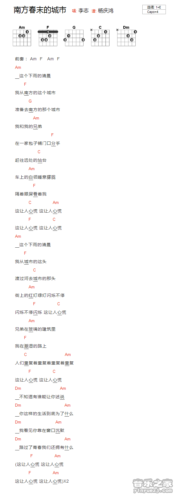 吉他李志《南方春末的城市》吉他谱_吉他弹唱谱_YYZJ编配