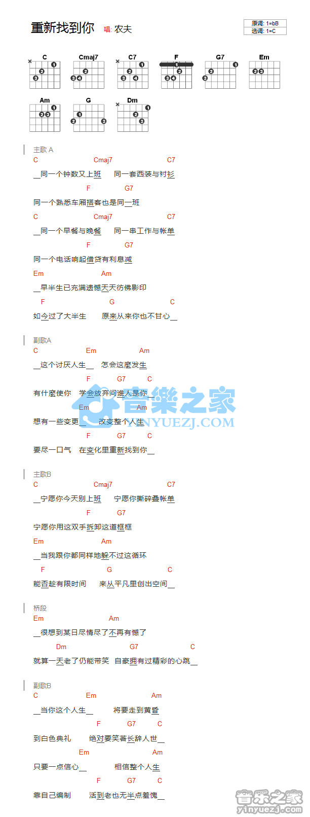 吉他农夫《重新找到你》吉他谱_吉他弹唱谱_YYZJ编配