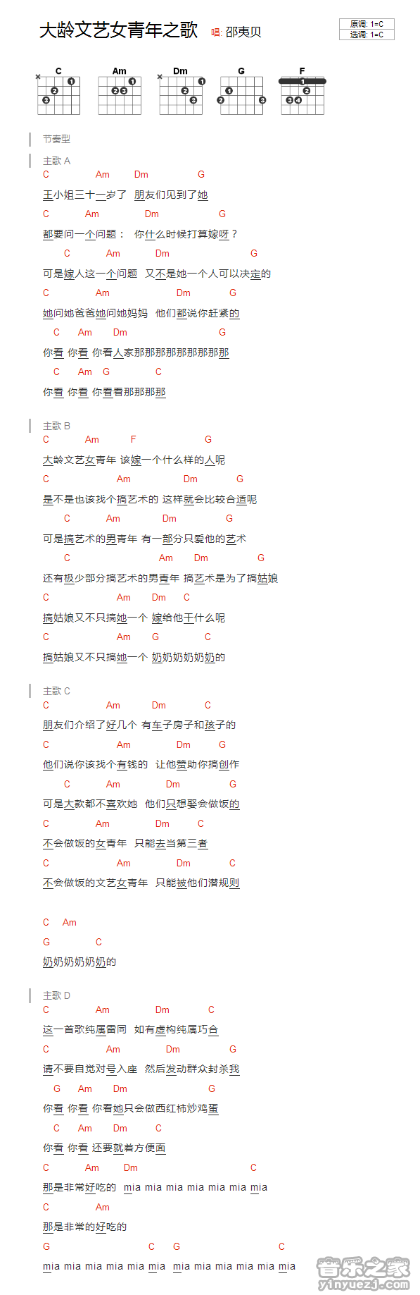 吉他邵夷贝《大龄文艺女青年之歌》吉他谱_吉他弹唱谱_YYZJ编配