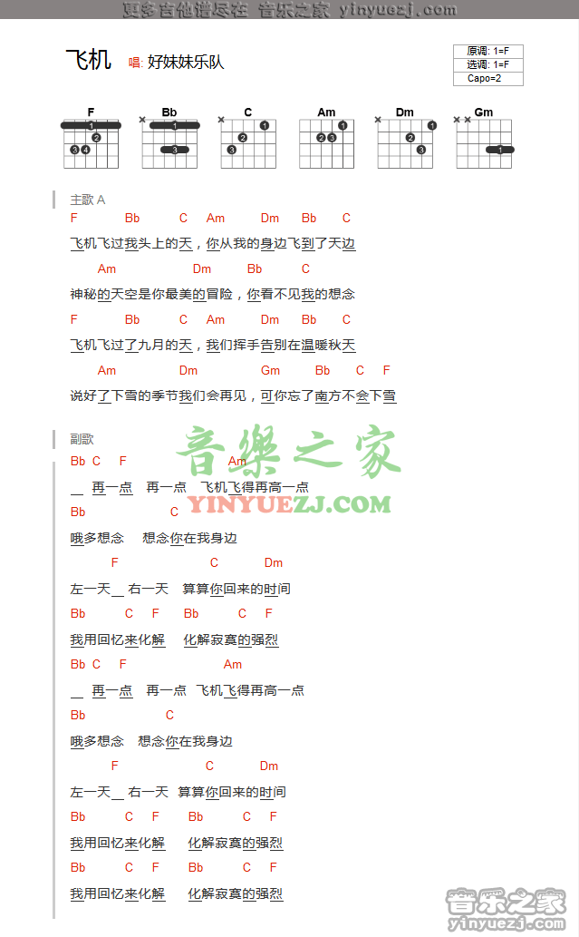 吉他好妹妹乐队《飞机》吉他谱_吉他弹唱谱_YYZJ编配