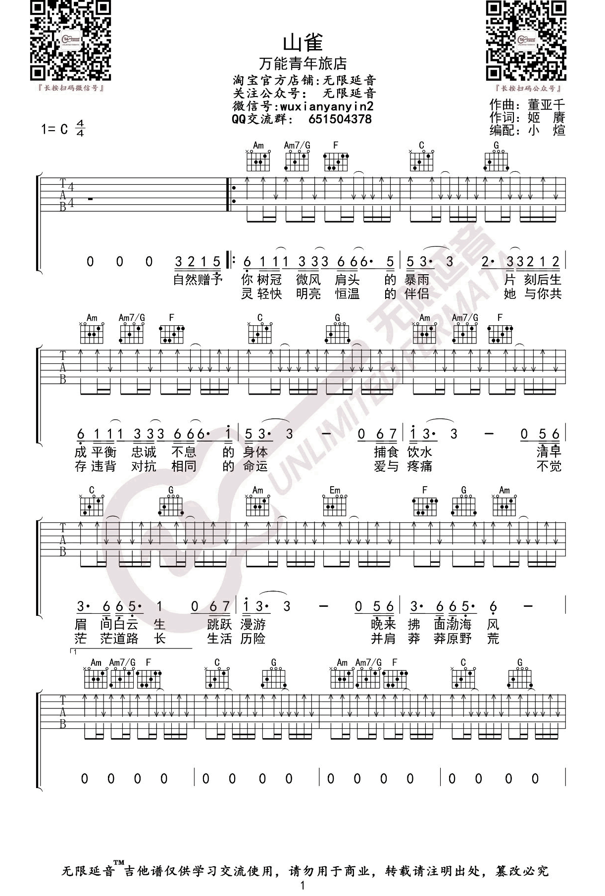 吉他万能青年旅店《山雀》吉他谱_吉他弹唱谱_无限延音编配
